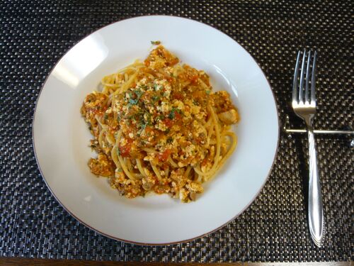 ご訪問ありがとうございます。 今回の食材テーマは“美味しい、ヘルシー”(どこかで聞いたような…?)さらに“経済的”と、いいこと三拍子が揃う『豆腐』です。いつもながら第1回はトマトソースのパスタです。 ★豆腐とひき肉のトマトスパゲッティ 材料(少なめ1…