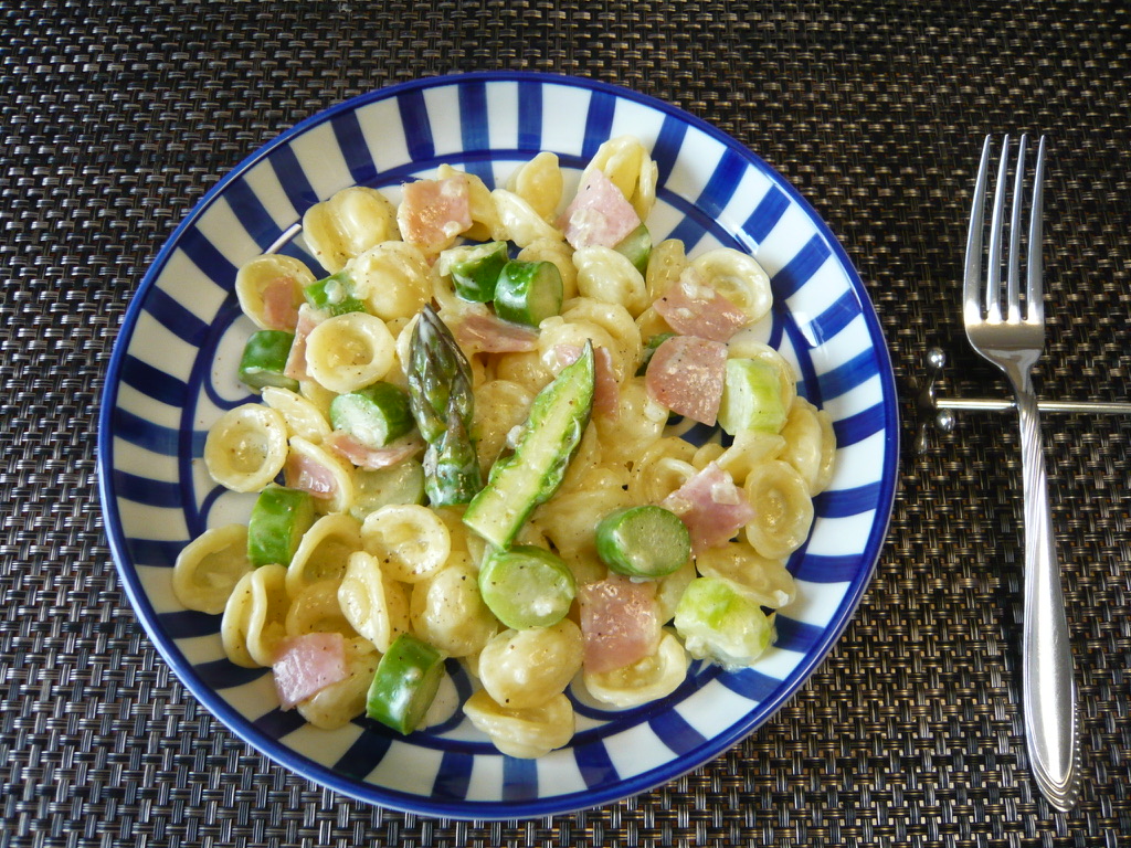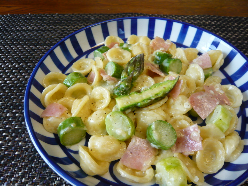 直径約2㎝の極太アスパラを輪切り(?)にして、ほぼ同じ形と大きさになりそうなショートパスタのオレッキエッテを合わせてみました。コロコロとしてなんとなく可愛らしいかな?