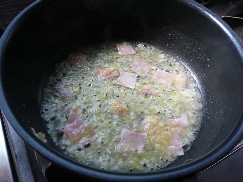 - フライパンにオリーブオイル少量とバター、ニンニクを入れて弱火にかける。バターが溶けてニンニクが少し香ってきたらタマネギを入れて炒める。別鍋でパスタのオレッキエッテを茹で始める。(袋に表示の標準茹で時間11分を表示通りに茹でています。)