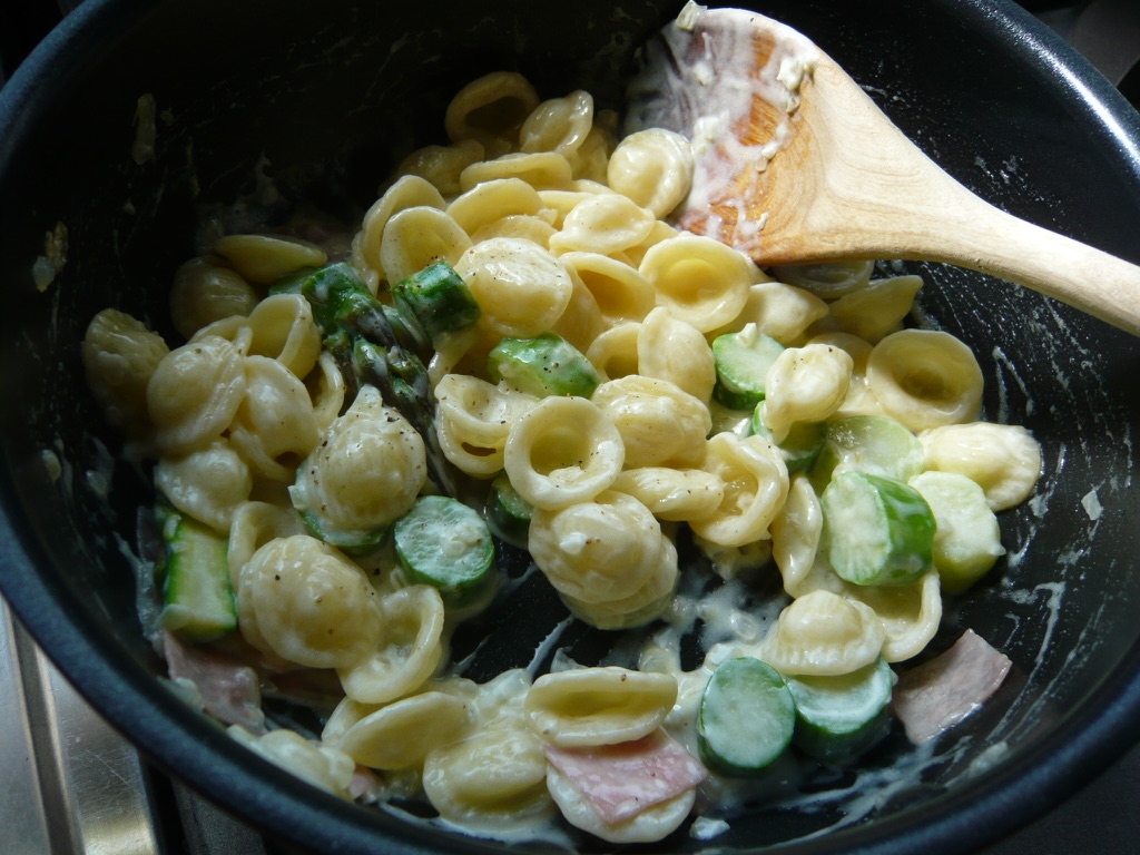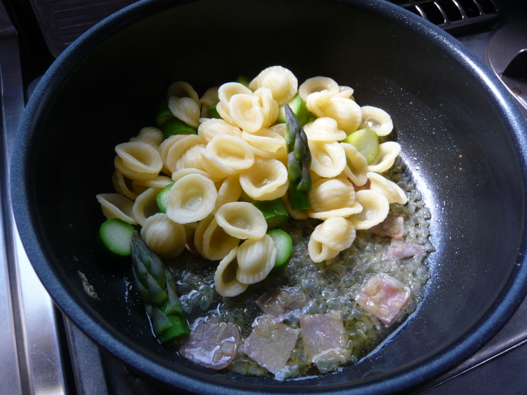 - 茹で上がったオレッキエッテとアスパラをフライパンに移し、ソースとよく和える。