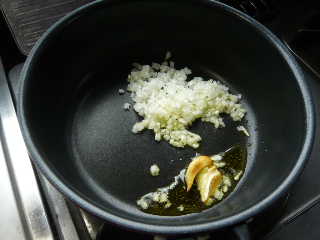 - フライパンにオリーブオイルとニンニクを入れて弱火にかける。ニンニクが色づいてきたらタマネギを入れて炒める。