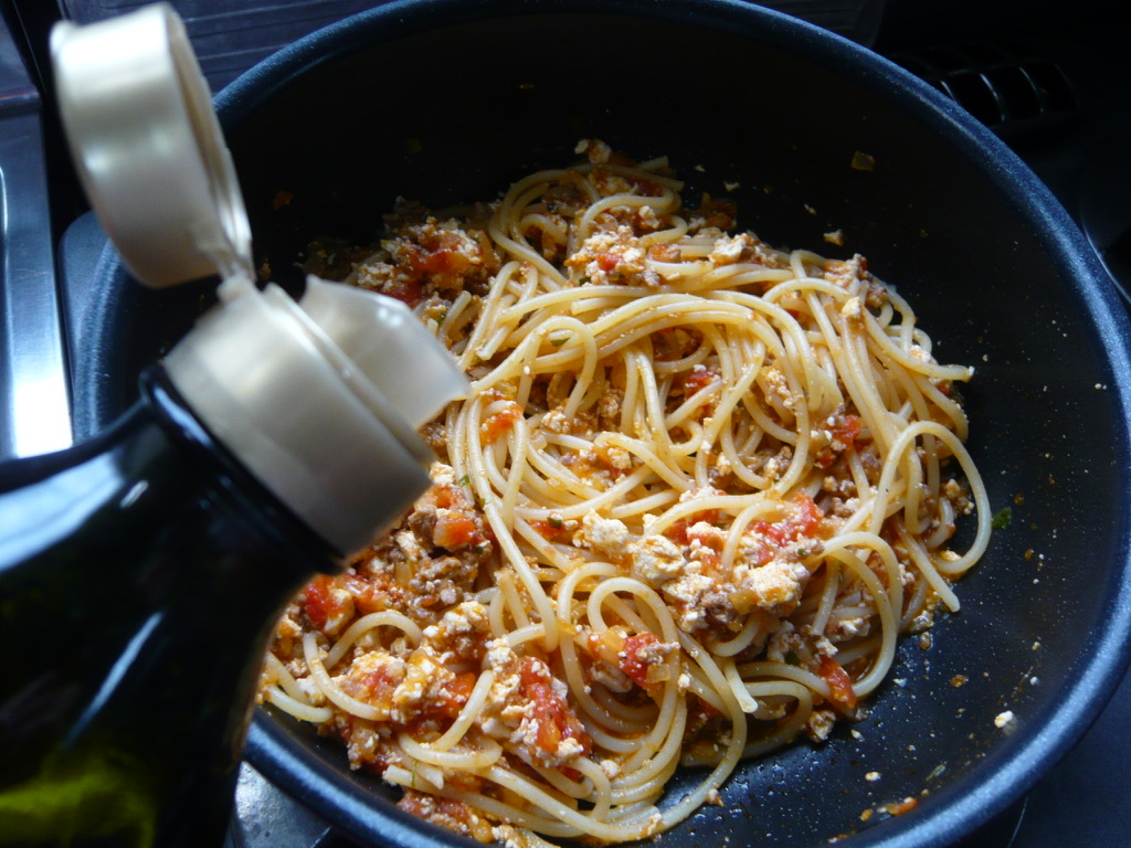 - スパゲッティが茹で上がる2分くらい前に、フライパンのソースに崩した豆腐を加え、