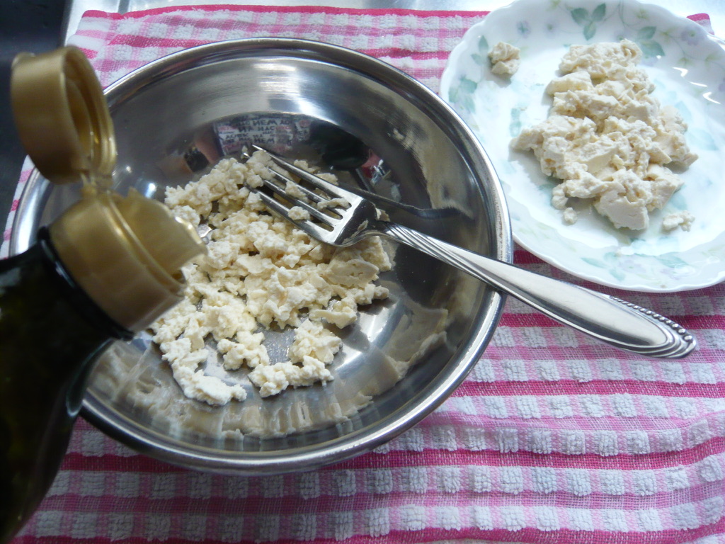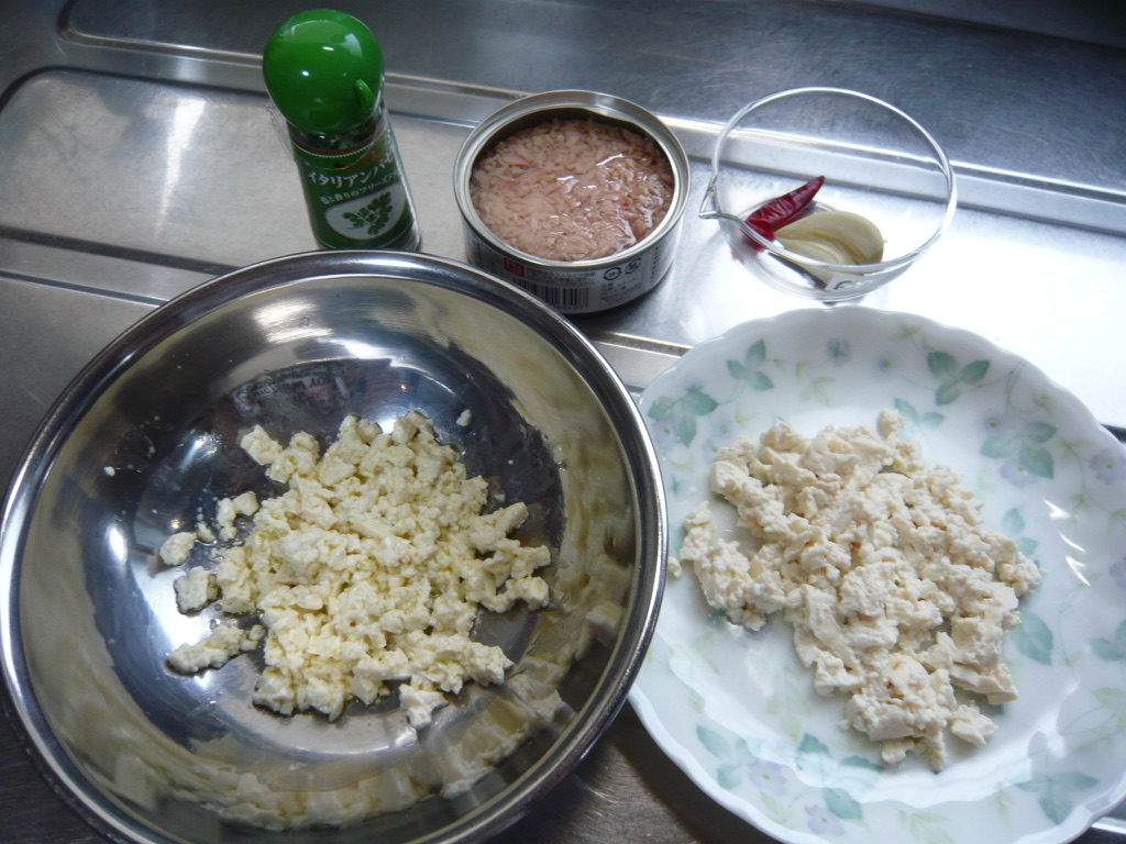 ③下味をつける:潰した豆腐を半分に分け、半分はそのまま、もう半分は軽く塩、コショウ、オリーブオイル少量加えてザッと混ぜておく。