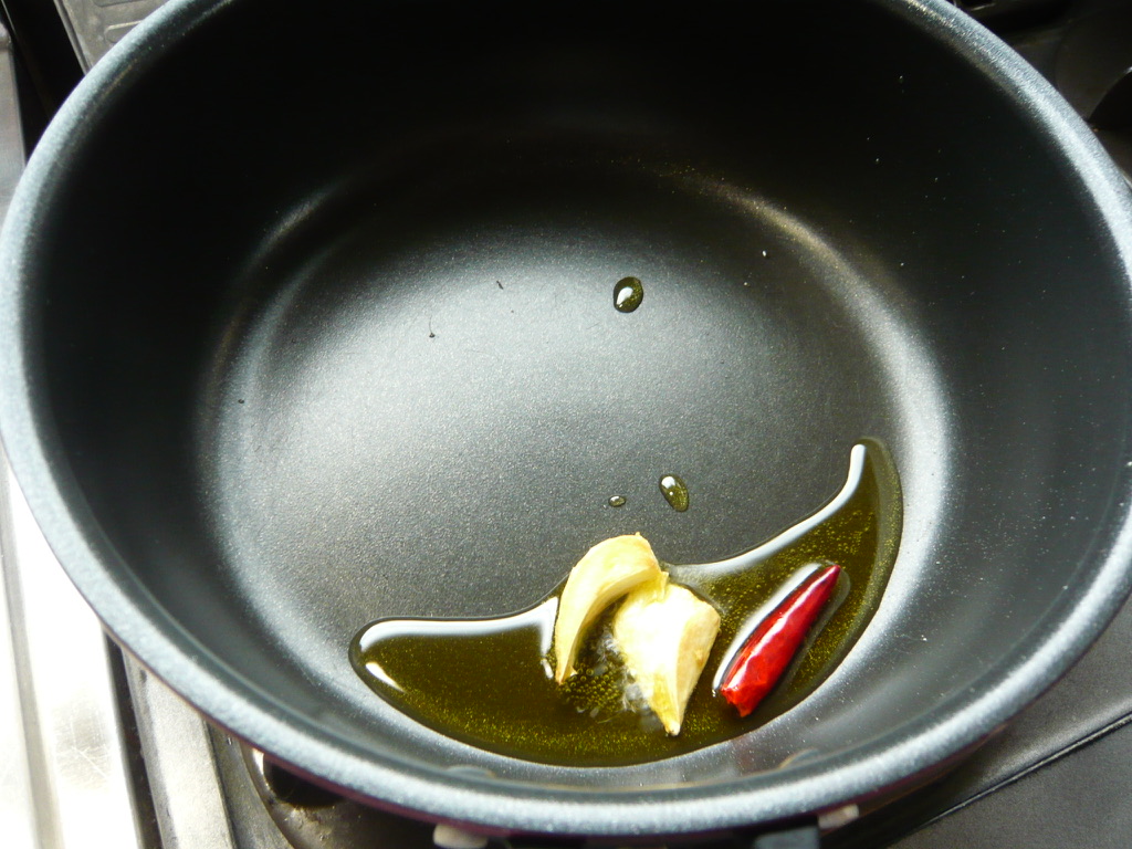 - フライパンにオリーブオイルとニンニクを入れて弱火にかける。ニンニクが色づいてきたら赤唐辛子を入れて加熱する。