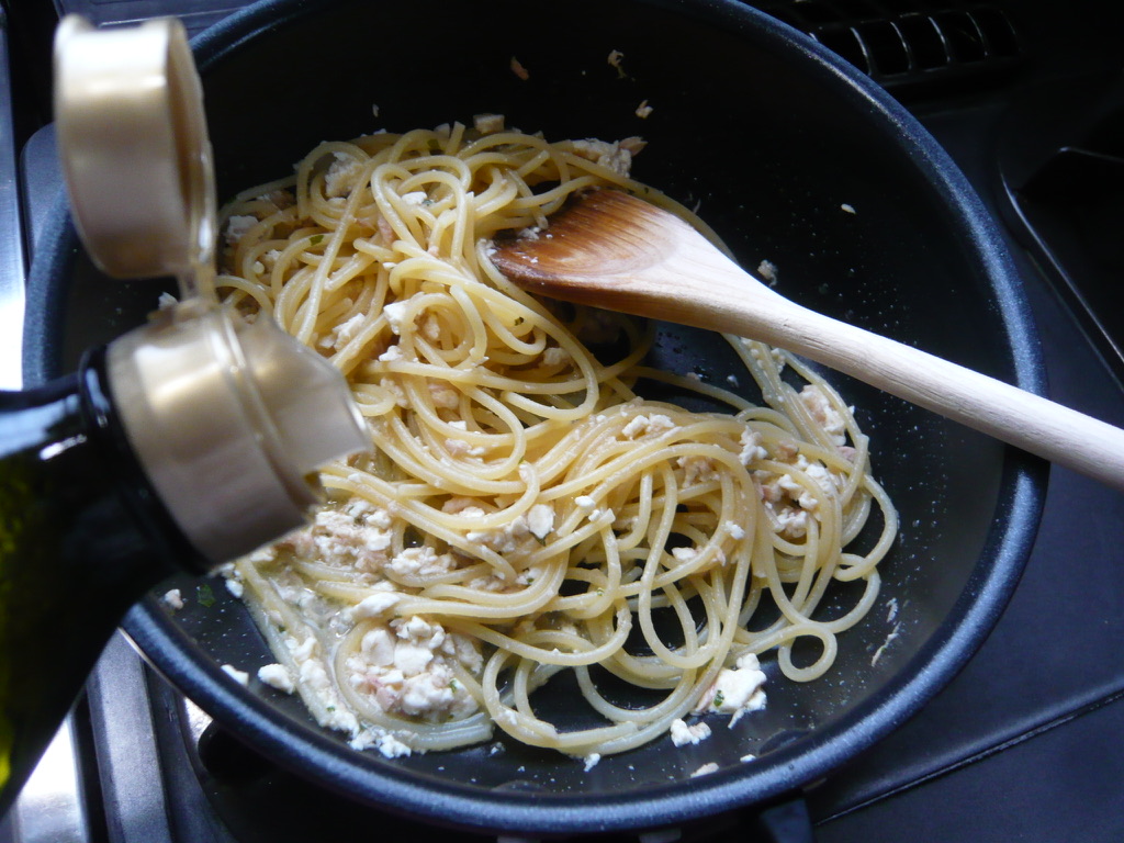 - 茹で上がったスパゲッティをフライパンに移し、ソースとよく和える。