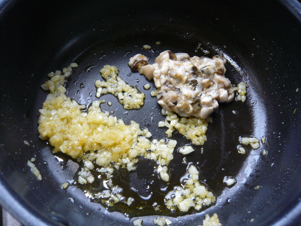 タマネギが透き通ってしんなりしてきたら、刻んだ牡蠣を入れて炒め合わせる。別鍋でスパゲッティを茹で始める。(袋に表示の標準茹で時間7分を6分で茹でています。)
