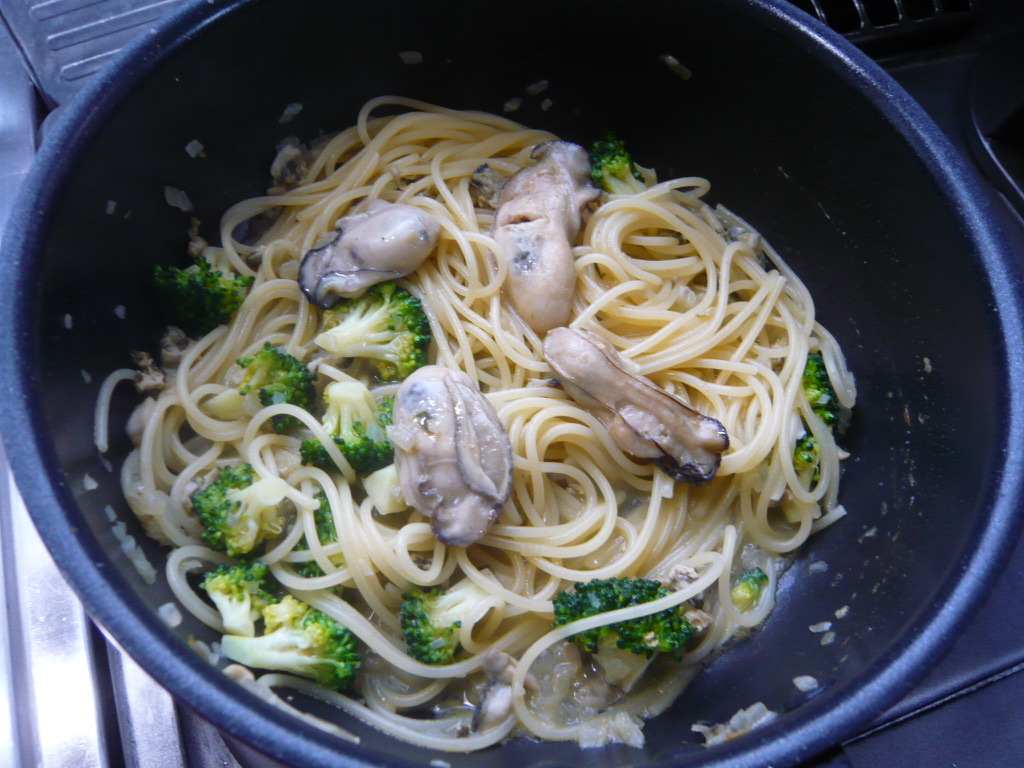 2回目。牡蠣とブロッコリーを合わせたアーリオオーリオペペロンチーノに挑戦。菜の花よりクセのない、我が家の定番常備野菜ブロッコリーに変更。牡蠣の小麦粉コーティングはやめて、牡蠣の旨味倍増作戦として半量を刻んでソースに加えてみました。が、全体量が少なかったので(ケチりました)効果半減。丸ごとの牡蠣とブロッコリーはそれぞれ単体で?美味しくいただきましたが、ひと皿の料理としては落第。