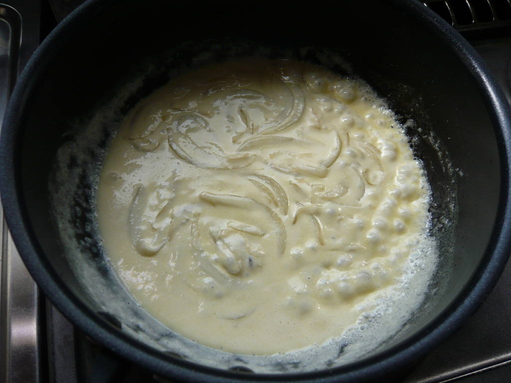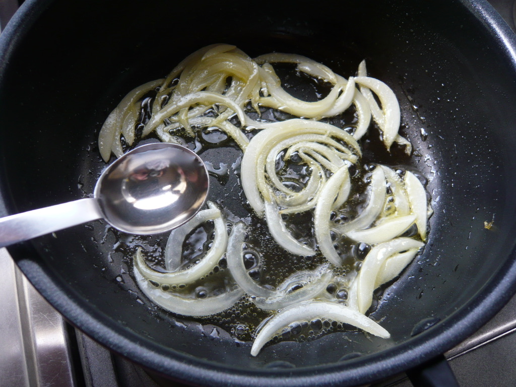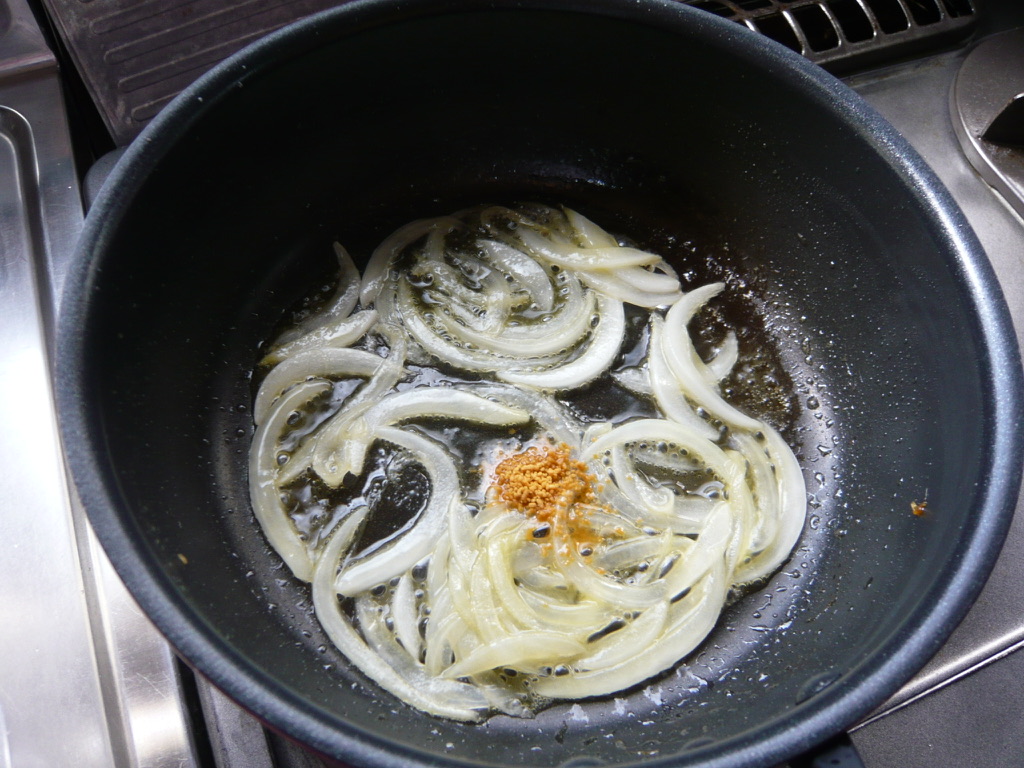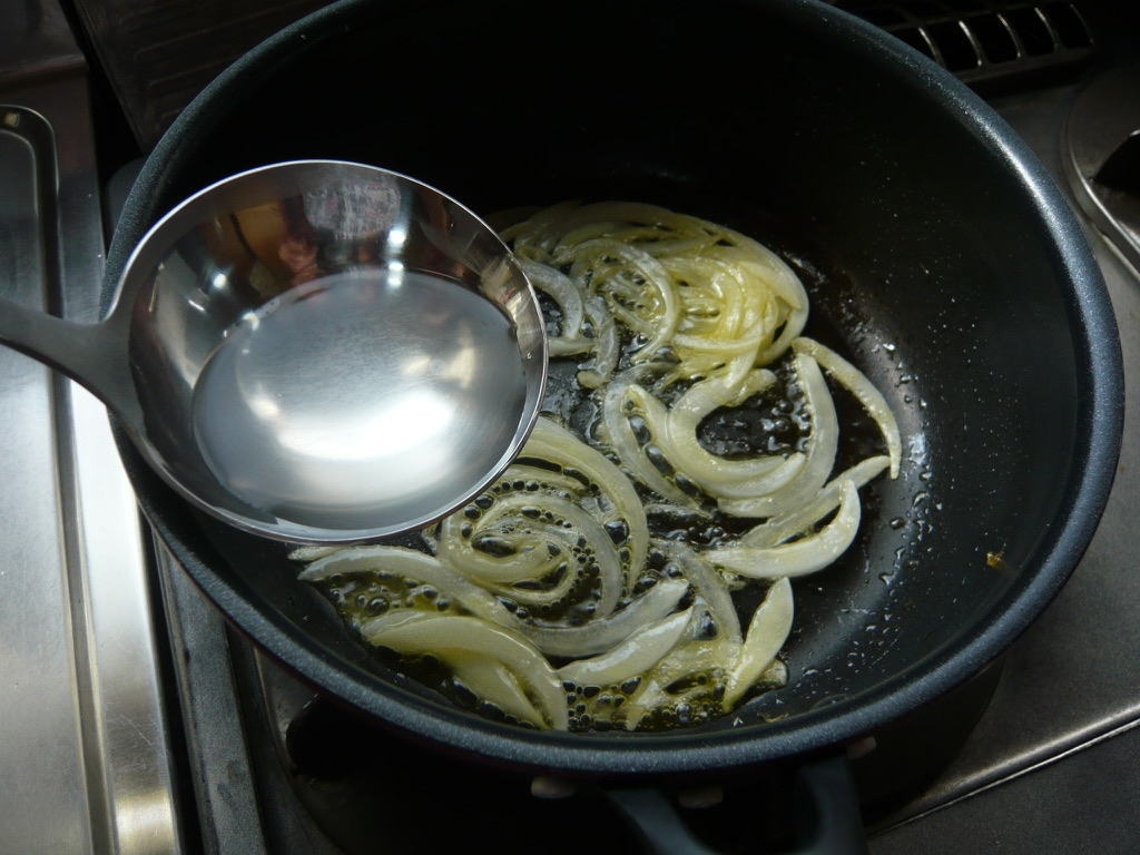 - タマネギがしんなりして柔らくなったら白ワインを加えて強火で煮詰め、