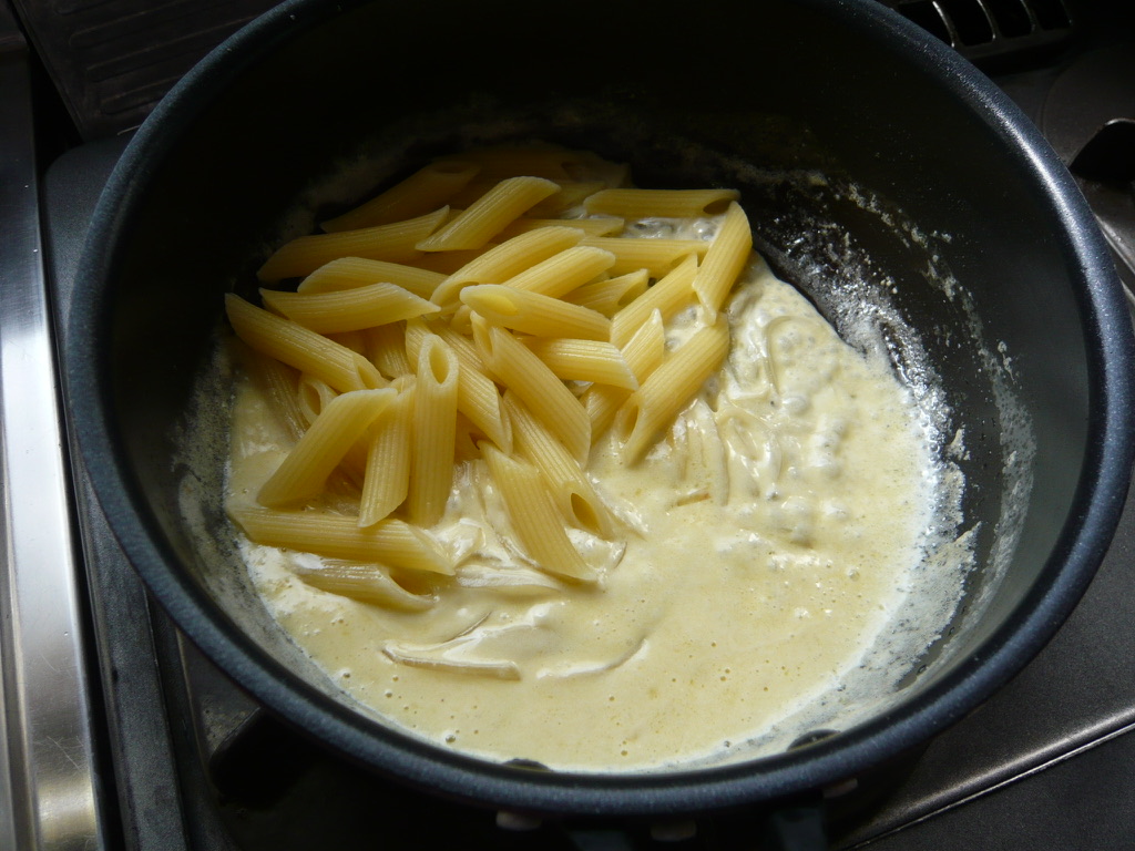 - 茹で上がったペンネをフライパンに移し、