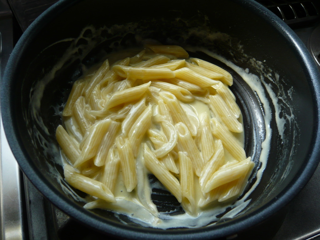- フライパンにオリーブオイルとバターを入れて温め、タマネギも加えて弱火で焦がさないよう炒める。別鍋でパスタのペンネを茹で始める。(袋に表示の標準茹で時間13分を12分で茹でています。)