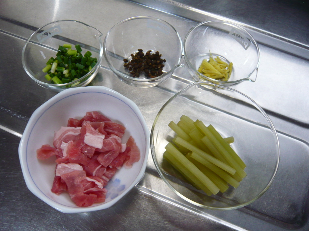 - フライパンにオリーブオイルとショウガを入れて弱火にかける。ショウガの香りが立ったら豚肉を加えて炒める。