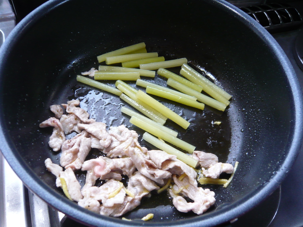 豚肉が白っぽくなったら、ふきを加えて炒め合わせる。別鍋でスパゲッティを茹で始める。(袋に表示の標準茹で時間8分を7分で茹でています。)