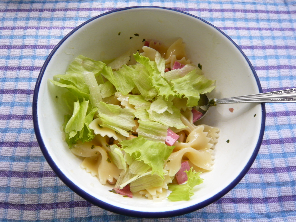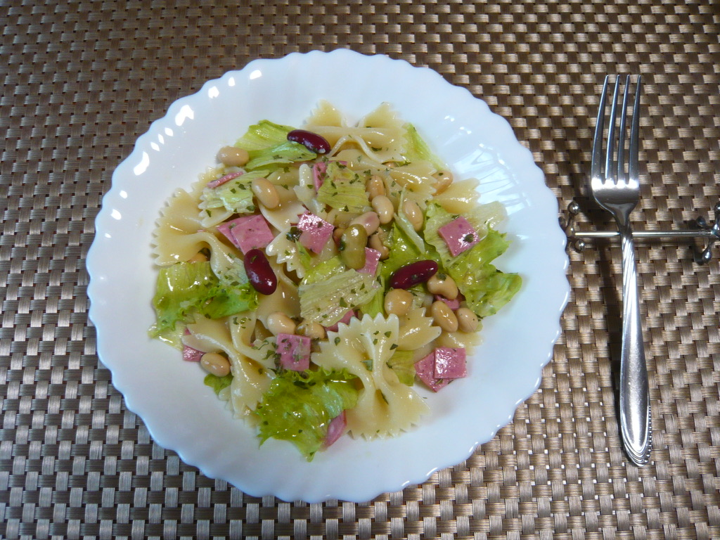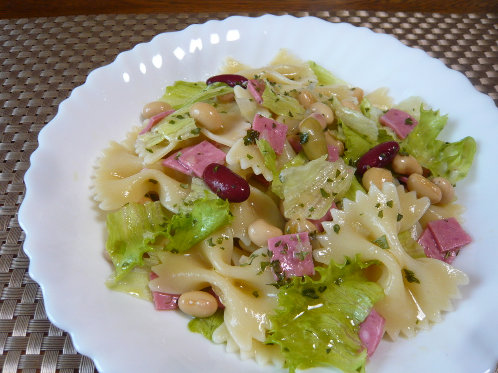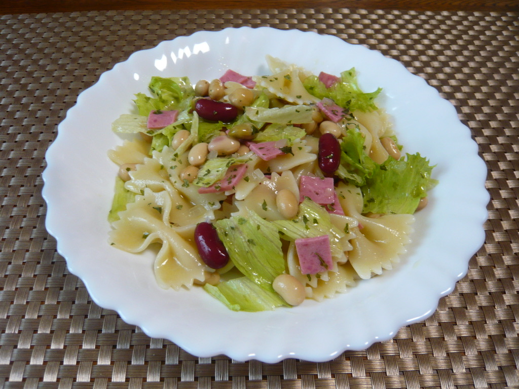 最後に加えたレタスで見た目もサラダ感増し増しです。レタスの爽やかな香りとマリネの酸味が相まってスッキリ&サッパリ〜夏らしさも増し増しです(秋だけど)。レタスのシャキシャキ、豆のホックリ、パスタのモチモチ、と食感の違いも楽しいひと皿、たいへん美味しくいただきました。