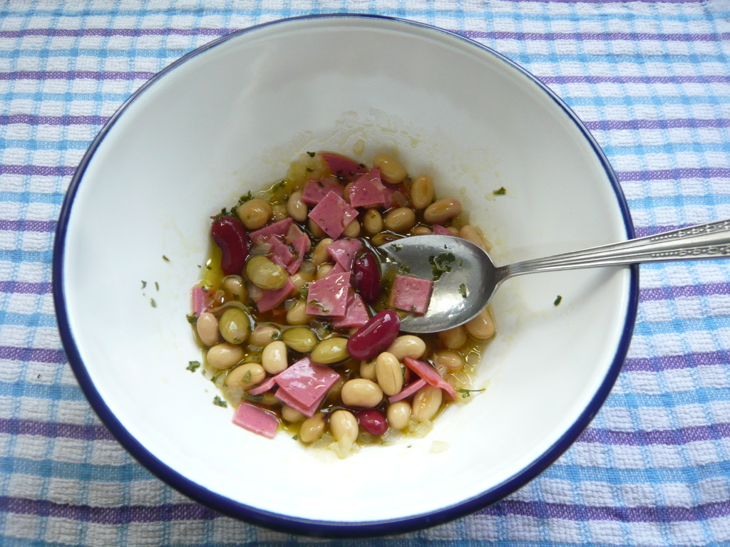 *薄切りボロニアソーセージ(通称モーニングアシスト?)はハムみたいなので、タイトルには『豆とハム〜』としています。