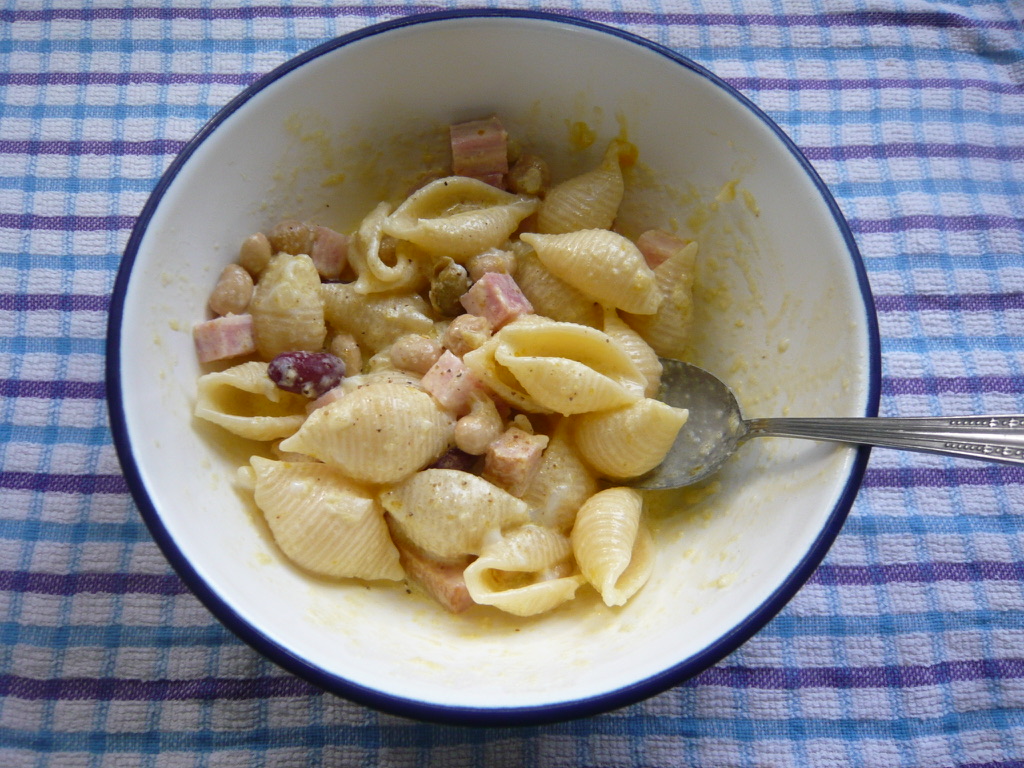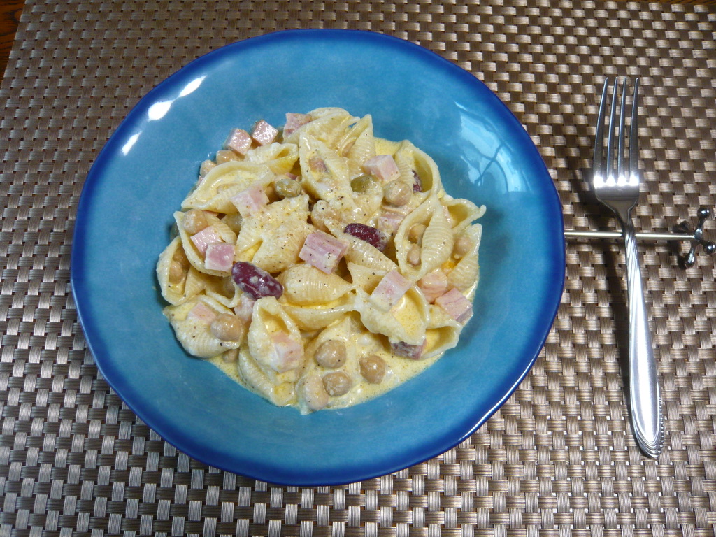 マリネ液が酸味控えめなので、カルボナーラ風ともうまくマッチしてくれたと思います。マリネにした豆との相性も良いようで、ソースに絡んだ豆がより一層美味しく感じます。そうそう主役は『豆』なのですよ!一瞬忘れました💦パスタのコンキリエの窪みに豆やベーコンも入ってくれて見た目も上々、気分も上々、たいへん美味しくいただきました。