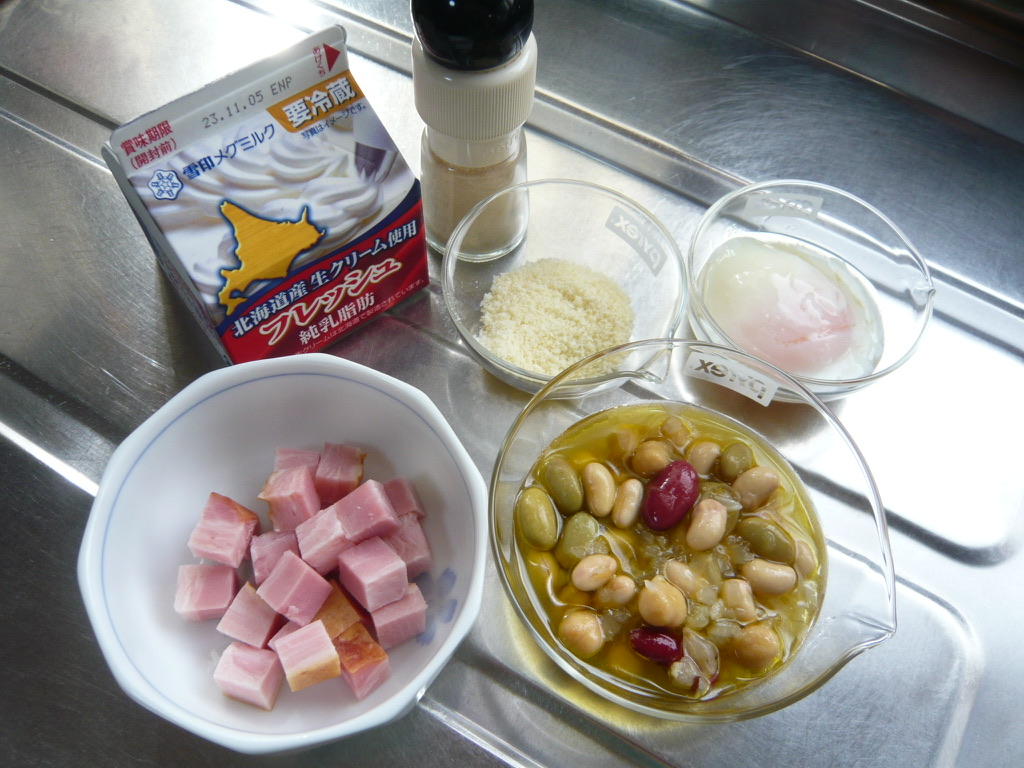 温泉たまごを使って冷たいカルボナーラ風にしてみました。なかなかイケます。