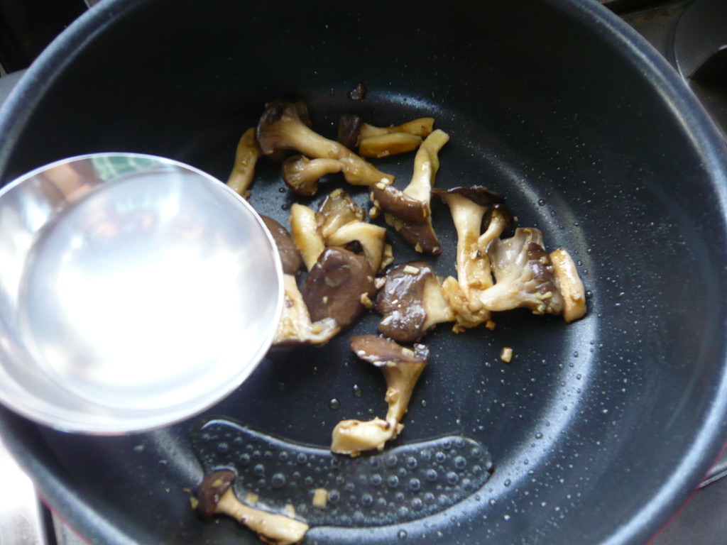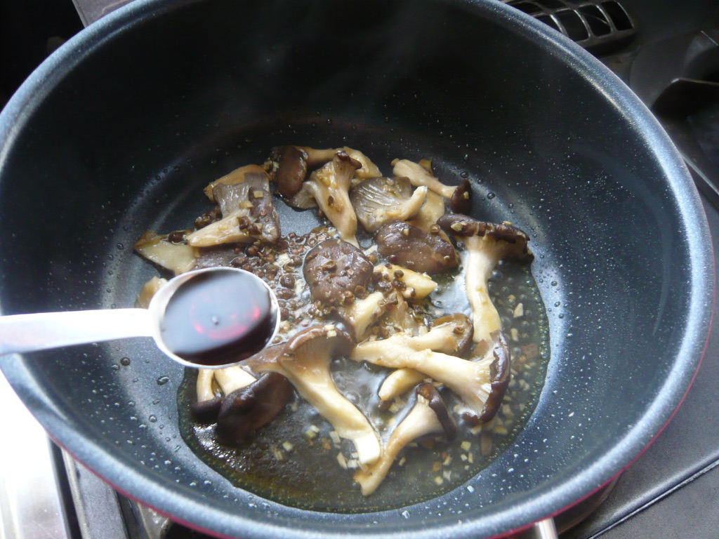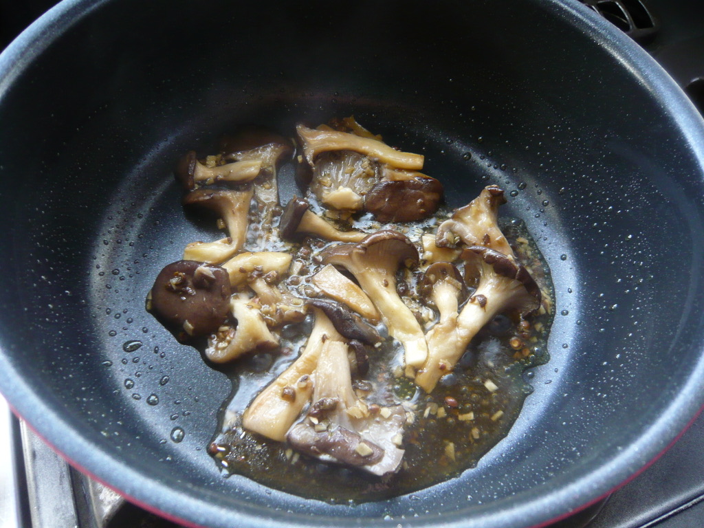 - フライパンにオリーブオイルとショウガを入れて弱火にかける。ショウガの香りが立ったらフライパンの空いたところに霜降りひらたけを入れ、少し火を強めて焼く。