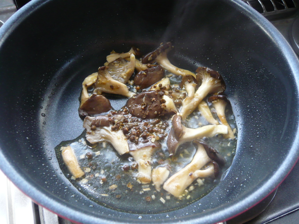 今回も具材は霜降りひらたけのみで作っています。アクセントになる風味にショウガを入れるか山椒にするかで迷った結果、両方入れましたが悪くないです。ショウガと山椒のそれぞれのピリッとした辛さと爽やか風味がケンカせず、霜降りひらたけを引き立ててくれたようでした。