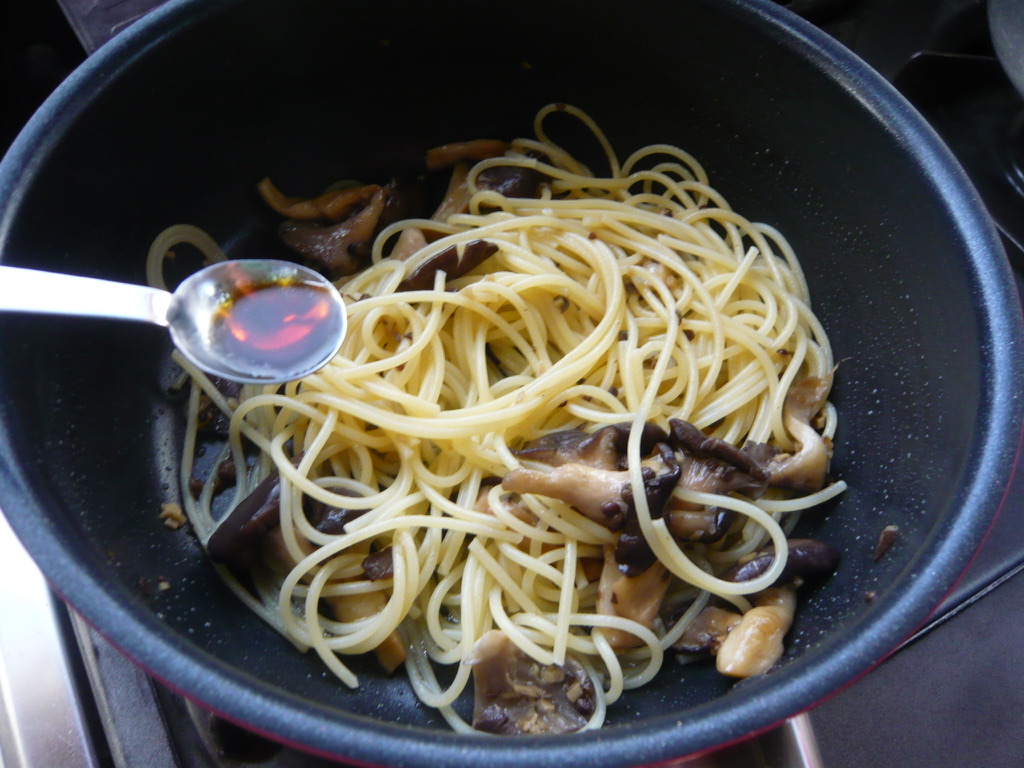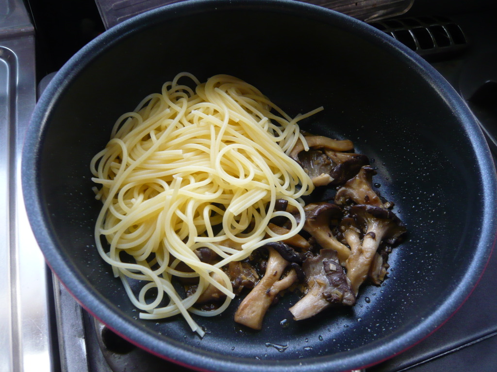 霜降りひらたけの簡単煮物をスパゲッティと合わせたような、いつもながらのお惣菜風スパゲッティ。霜降りひらたけの食感を楽しみたかったのでサッと煮た程度にしましたが、もう少し煮て、味が染みてクッタリした感じにしても美味しくいただけそうです。ご飯のお供にもなりそうです。