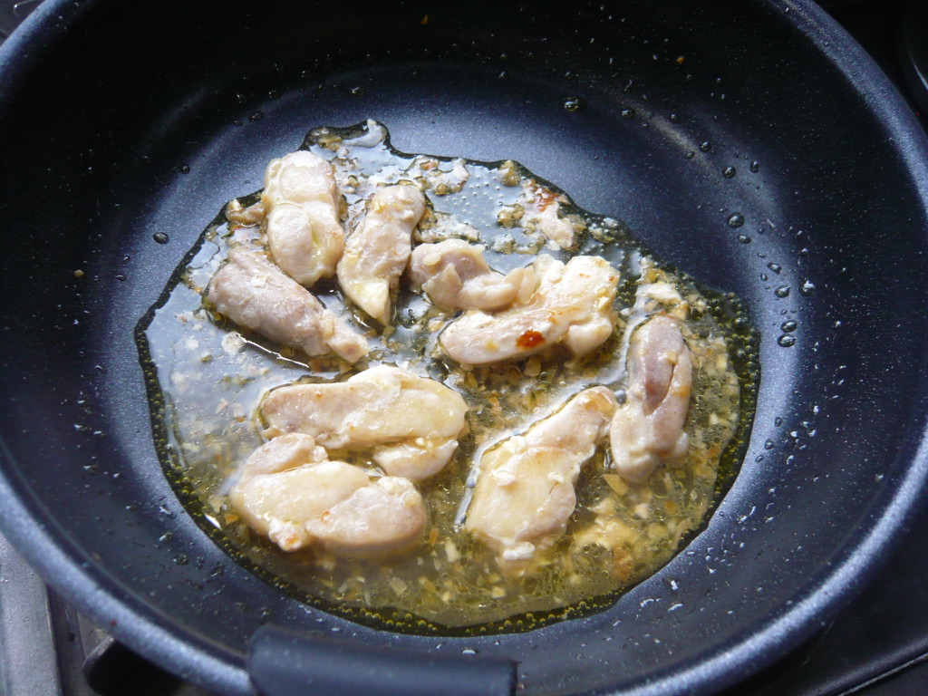 - フライパンにオリーブオイルとニンニクを入れて強火にかけ、ニンニクがシュワシュワしてきたら弱火に落とし、赤唐辛子を加える。ニンニクと赤唐辛子をフライパンの端に寄せ、ガスコンロの火元からフライパンをずらしてニンニクたちにあまり火が入らないようにして、火が当たるフライパンの空いたところで鶏肉を入れて焼く。