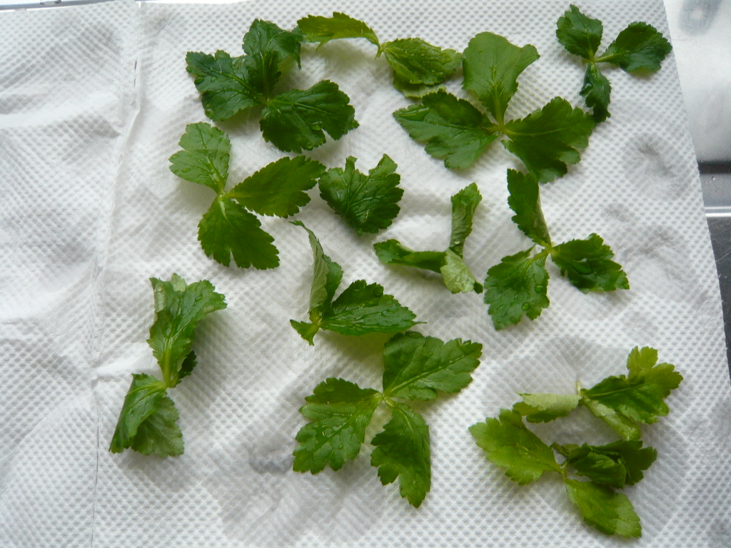 *スパゲッティが茹で上がるまでの間で、三つ葉の葉の部分の水気をペーパータオルなどで切っておく。