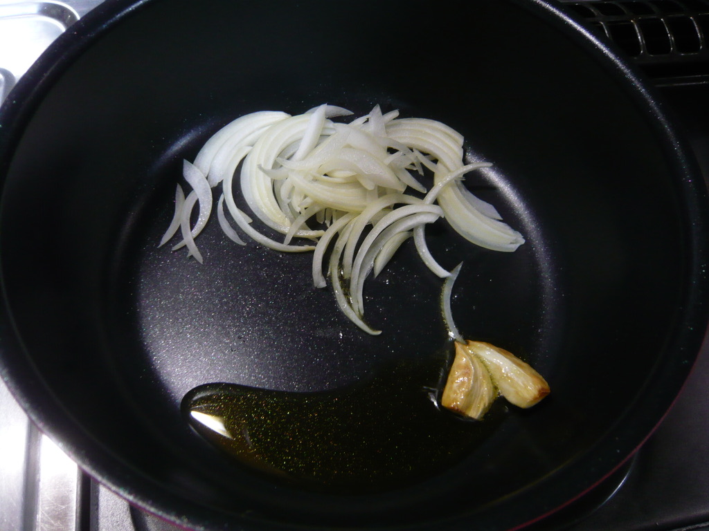 - フライパンに『自家製ツナ』のオイルとニンニクを入れて火にかける。ニンニクがシュワシュワしてきたら弱火に落とし、色づいてきたらタマネギを加えて炒める。