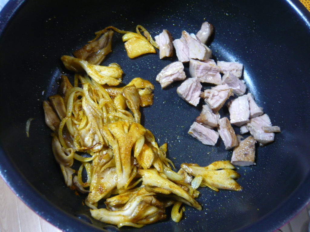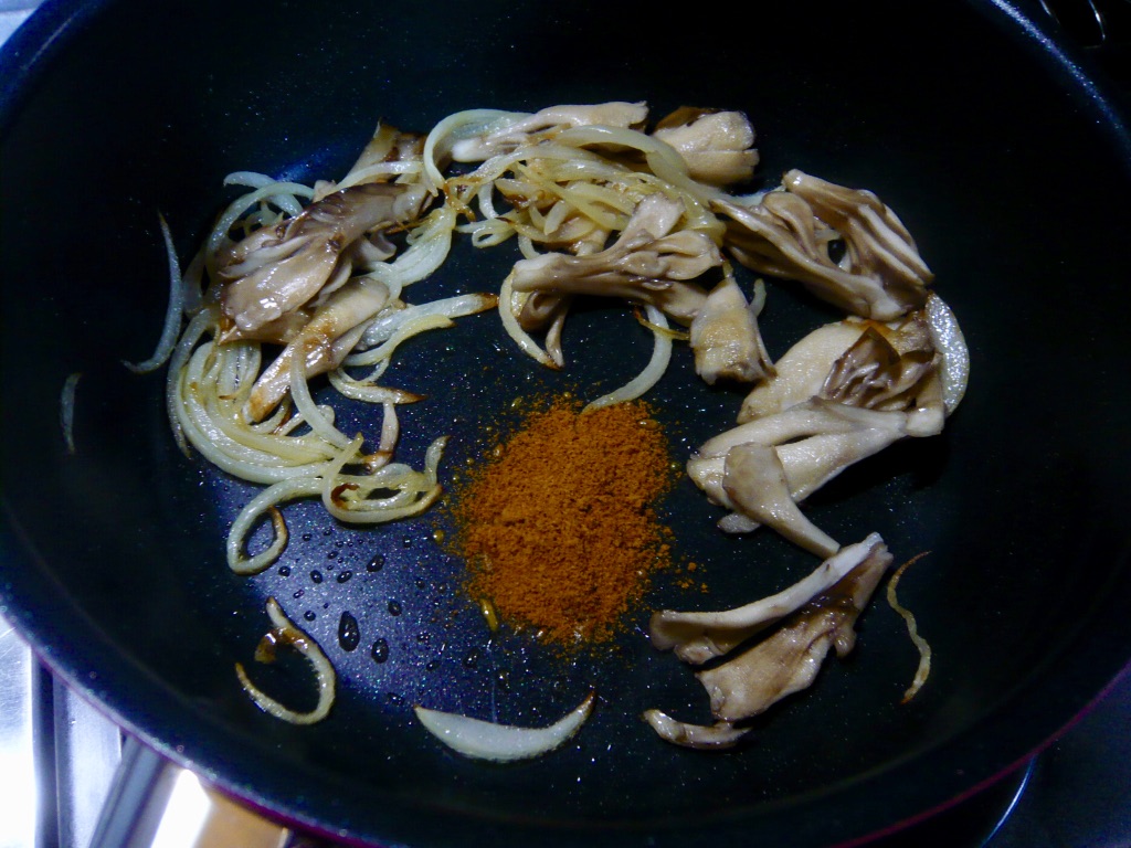 タマネギがしんなりしたらフライパンの端に寄せ、空いたところに舞茸を入れて火を少々強めて焼く。
