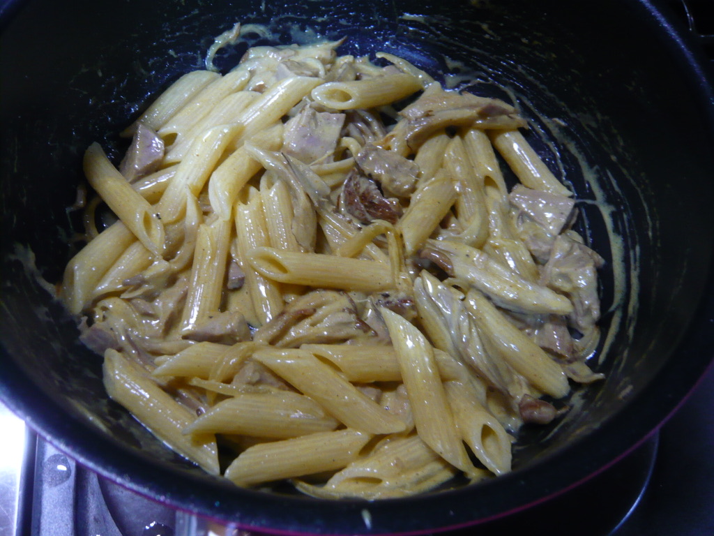 塩、黒コショウ少々加えて弱火で煮る。煮詰まってきたら火を止め、ペンネが茹で上がる少し前にフライパンを火にかけてソースを温める。