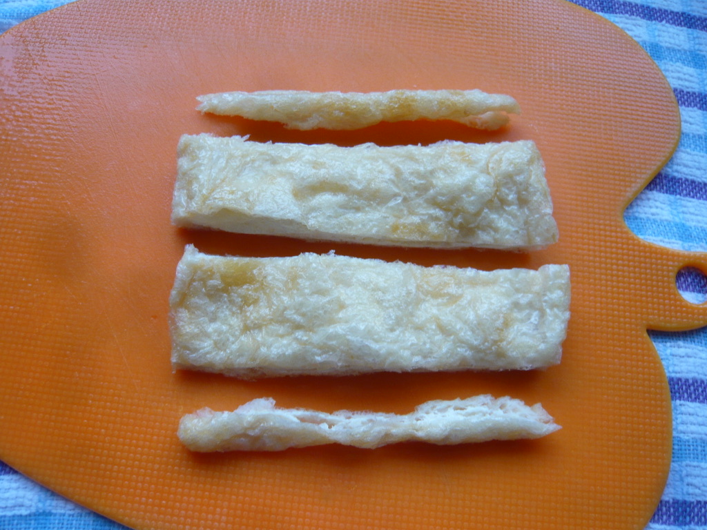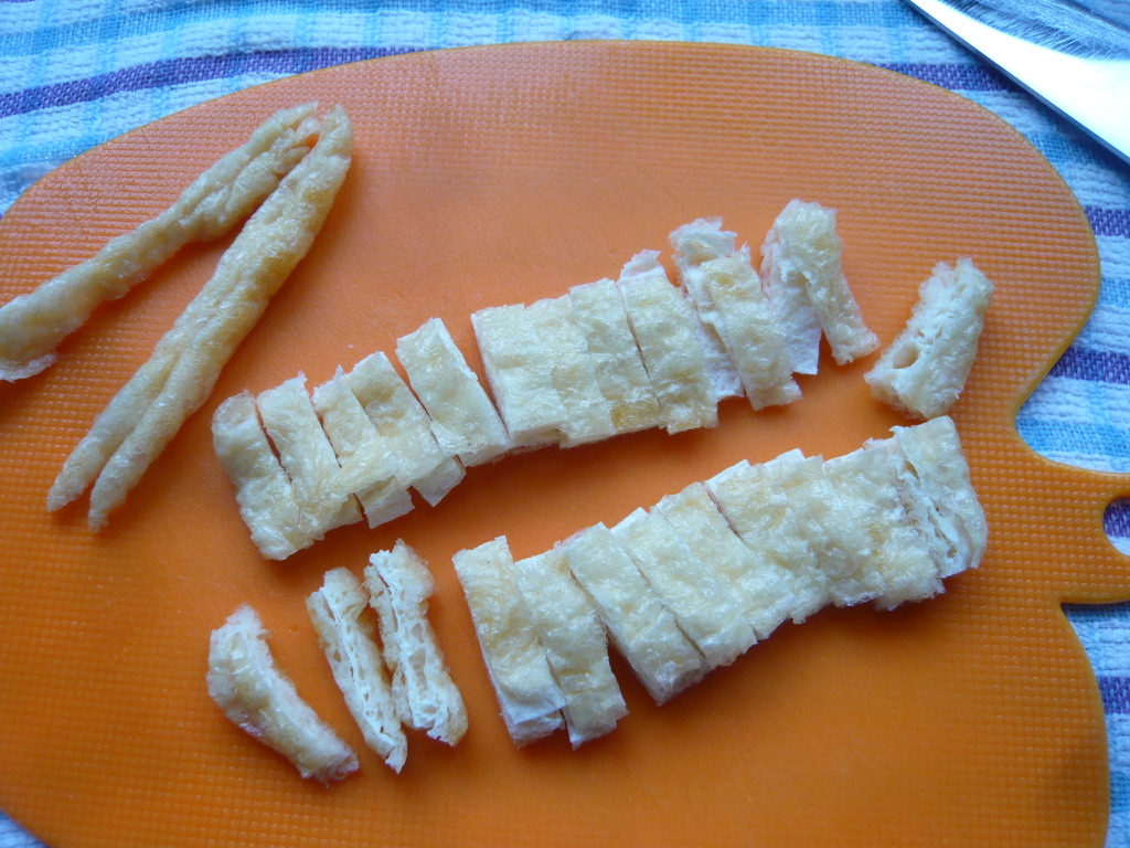 ①油揚げ:熱いお湯をかけて油抜きして水気を切る。両端を切り落として縦半分に切り、5㎜幅に切る。端の部分も同じくらいの長さに切って加える。