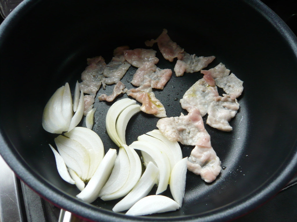 - フライパンにオリーブオイルを入れて火にかけて豚肉を広げて入れ、豚肉が白っぽくなってきたら新たまねぎを加えて炒める。