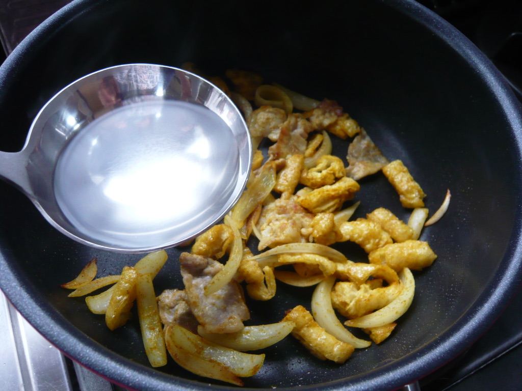 全体にカレー粉が回ったら日本酒を加えて強火で煮立て、