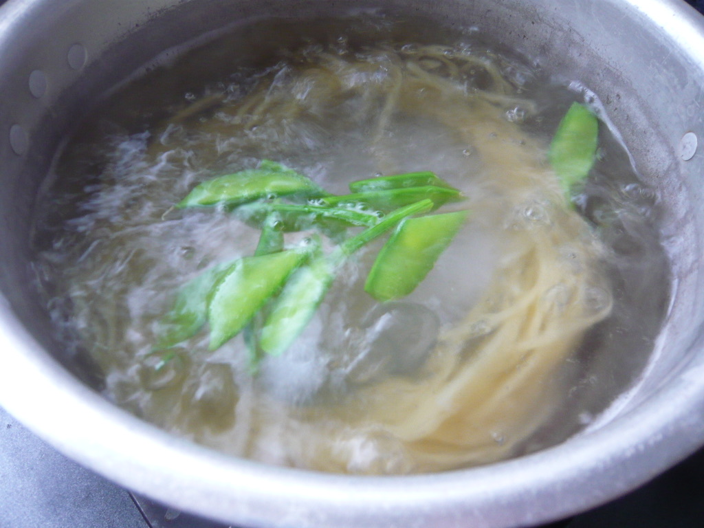 - スパゲッティを茹でている鍋に、スパゲッティが茹で上がる1分前に絹さやを入れて一緒に茹で上げる。