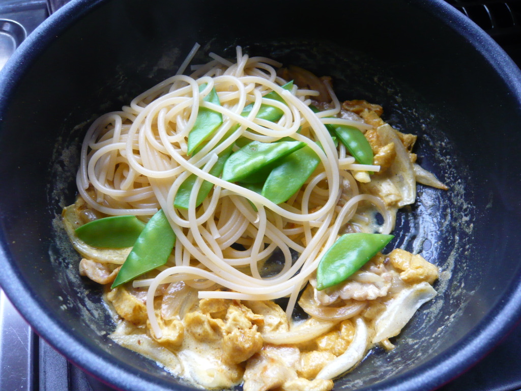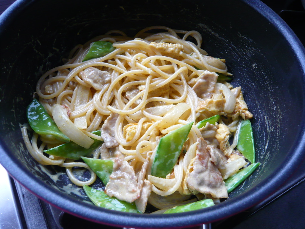 - フライパンの中央を空けてカレー粉を入れて弱火で炒め、カレー粉の香りが立ったら全体を炒め合わせる。別鍋でスパゲッティを茹で始める。(袋に表示の標準茹で時間9分を8分で茹でています。)