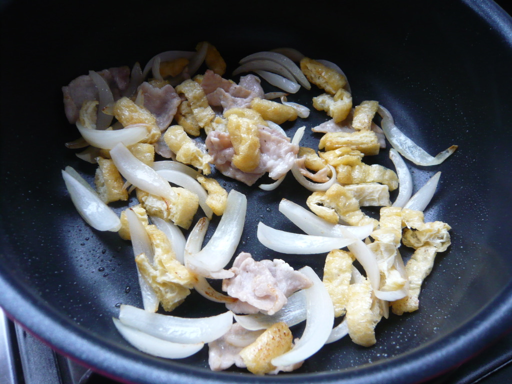 油揚げに軽く焼き色がついたら、豚肉&新たまねぎと油揚げを炒め合わせる。