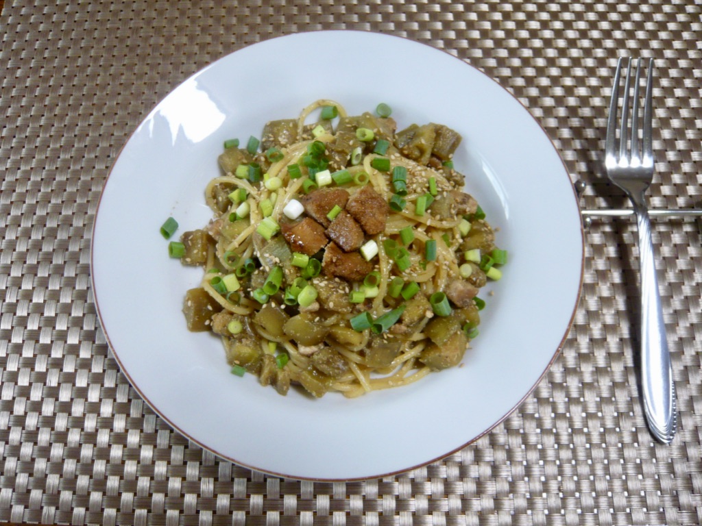 - フライパンにオリーブオイルと少々のごま油を入れ、ナスを加えて炒める。