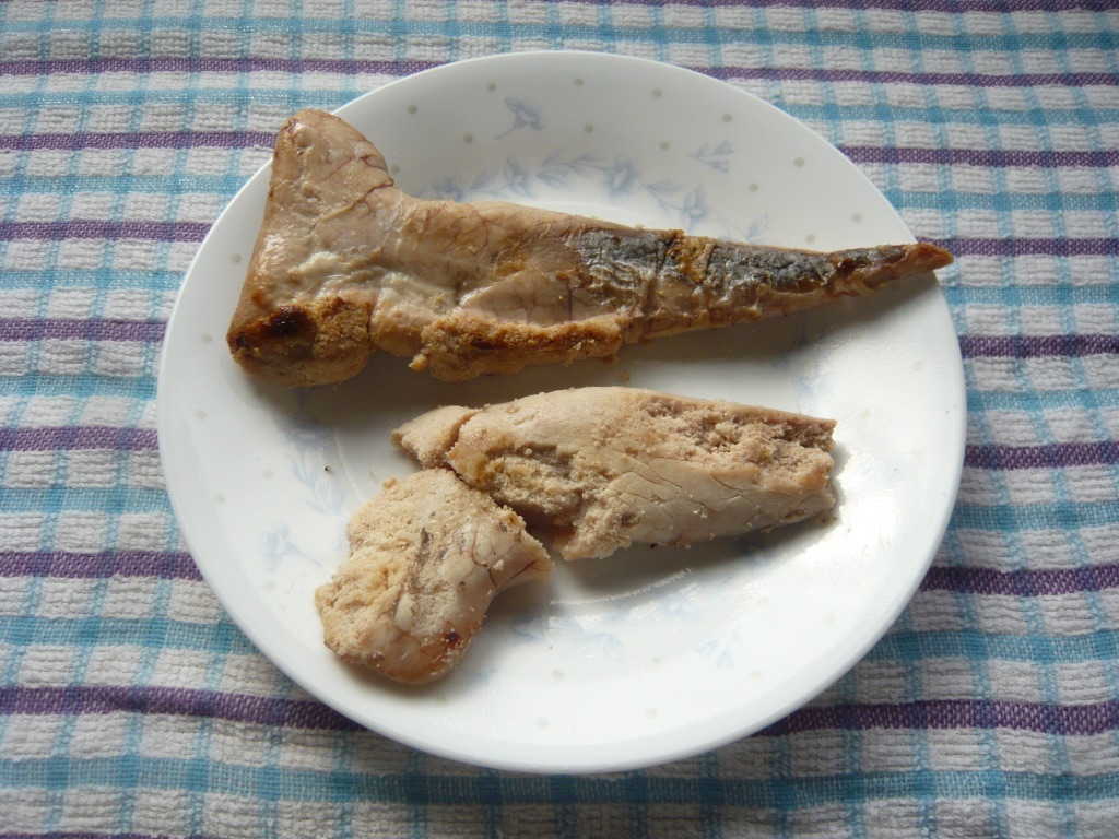 *『真ガレイの香草焼き』の残りもの。加熱したものですが中は半生。骨から外す際に1本崩れました。汚く見えますが齧ったものではありません💦